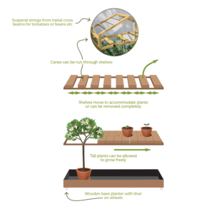 The Tomato Greenhouse is a compact, upright greenhouse specially designed for tomatoes. It features a lined trough at the base for planting the tomatoes, with the frame of the greenhouse providing support for their tall growth at maturity.